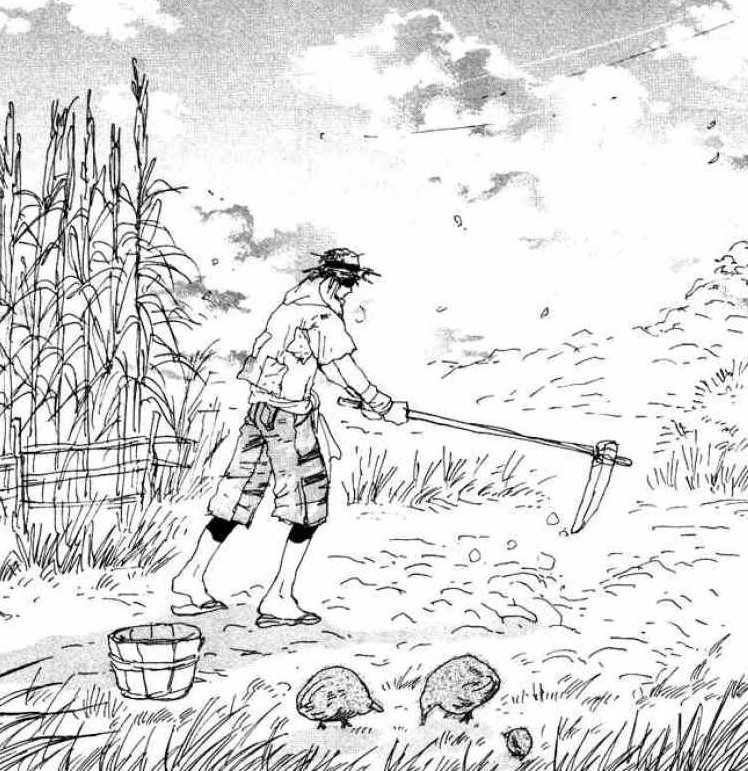 His first appearance was in chapter 20 of the series, Pampas Grass chapter, "Ants and Potatoes" when he got discovered by Natsu while working the fields. Izayoi helped the sick Arashi who got stung by a Black Fever wasp and offered his house to the travellers for recovery.